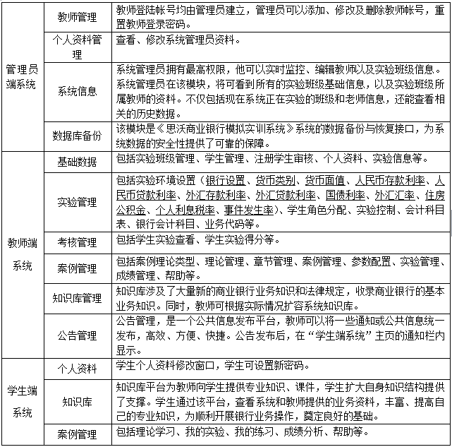 另一方面,為(wei)(wei)了(le)(le)加(jia)強學(xue)生對商(shang)業(ye)(ye)銀(yin)(yin)行(xing)(xing)網(wang)(wang)上(shang)(shang)(shang)(shang)銀(yin)(yin)行(xing)(xing)業(ye)(ye)務的(de)(de)了(le)(le)解,我(wo)們(men)在參(can)照(zhao)、歸納商(shang)業(ye)(ye)銀(yin)(yin)行(xing)(xing)主要(yao)受理、承辦的(de)(de)網(wang)(wang)上(shang)(shang)(shang)(shang)業(ye)(ye)務之后,經過研(yan)究分析開(kai)發(fa)出“思沃網(wang)(wang)上(shang)(shang)(shang)(shang)銀(yin)(yin)行(xing)(xing)系(xi)統(tong)(tong)”。由個(ge)人(ren)網(wang)(wang)上(shang)(shang)(shang)(shang)業(ye)(ye)務、企(qi)業(ye)(ye)網(wang)(wang)上(shang)(shang)(shang)(shang)業(ye)(ye)務、銀(yin)(yin)行(xing)(xing)后臺系(xi)統(tong)(tong)三部分組(zu)成(cheng),學(xue)生經過注冊(ce)成(cheng)為(wei)(wei)合法的(de)(de)個(ge)人(ren)客戶或企(qi)業(ye)(ye)客戶,登錄系(xi)統(tong)(tong),演練相(xiang)應的(de)(de)個(ge)人(ren)版網(wang)(wang)上(shang)(shang)(shang)(shang)銀(yin)(yin)行(xing)(xing)和企(qi)業(ye)(ye)版網(wang)(wang)上(shang)(shang)(shang)(shang)銀(yin)(yin)行(xing)(xing)業(ye)(ye)務,使學(xue)生逐步熟悉網(wang)(wang)上(shang)(shang)(shang)(shang)銀(yin)(yin)行(xing)(xing)業(ye)(ye)務的(de)(de)實(shi)際(ji)操(cao)作和后臺管理流程。本(ben)公司(si)為(wei)(wei)了(le)(le)更好(hao)滿(man)足高校的(de)(de)教學(xue)需(xu)求,會根據(ju)高校的(de)(de)需(xu)求提供商(shang)業(ye)(ye)銀(yin)(yin)行(xing)(xing)實(shi)訓室(shi)解決方案(an)。