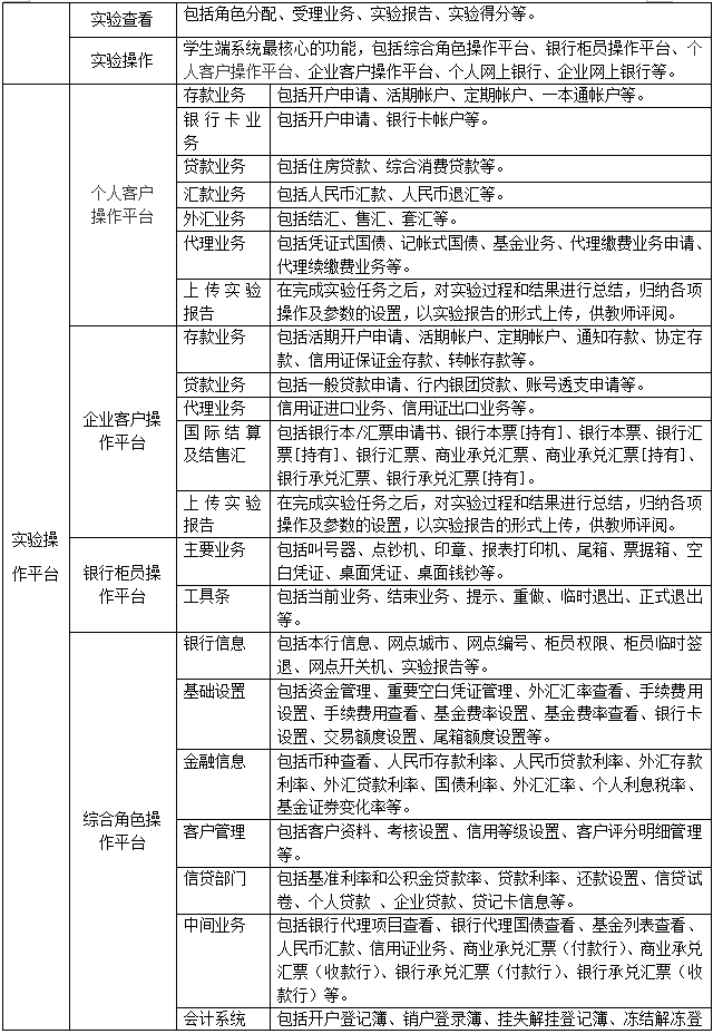 系統借鑒(jian)現代商(shang)業(ye)(ye)(ye)銀行(xing)(xing)(xing)最(zui)新的(de)管理(li)方法,參照商(shang)業(ye)(ye)(ye)銀行(xing)(xing)(xing)成熟的(de)業(ye)(ye)(ye)務(wu)(wu)流程,采(cai)用(yong)實(shi)驗形(xing)式全(quan)面模擬(ni)商(shang)業(ye)(ye)(ye)銀行(xing)(xing)(xing)個人(ren)業(ye)(ye)(ye)務(wu)(wu)、對公(gong)業(ye)(ye)(ye)務(wu)(wu)、網上銀行(xing)(xing)(xing)業(ye)(ye)(ye)務(wu)(wu)的(de)辦理(li)規程。使(shi)學(xue)(xue)生(sheng)(sheng)在掌握理(li)論知識(shi)的(de)同時熟悉銀行(xing)(xing)(xing)業(ye)(ye)(ye)務(wu)(wu)的(de)實(shi)際操作過程,培(pei)養商(shang)業(ye)(ye)(ye)銀行(xing)(xing)(xing)真正需要(yao)的(de)實(shi)用(yong)性(xing)人(ren)才,增強(qiang)學(xue)(xue)生(sheng)(sheng)的(de)社會就業(ye)(ye)(ye)競爭力。系統主(zhu)要(yao)包括如下十一個實(shi)驗項目(mu):