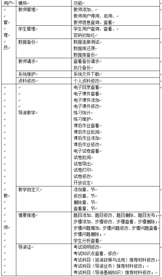 教師(shi)主要功能包括班級學生(sheng)管(guan)(guan)理(li)(li)、導(dao)(dao)游(you)基礎知識(shi)管(guan)(guan)理(li)(li)、國(guo)內(nei)導(dao)(dao)游(you)知識(shi)管(guan)(guan)理(li)(li)、國(guo)外導(dao)(dao)游(you)知識(shi)管(guan)(guan)理(li)(li)、情景(jing)題目管(guan)(guan)理(li)(li)、導(dao)(dao)游(you)證考試資料管(guan)(guan)理(li)(li)、模擬考試、導(dao)(dao)游(you)詞管(guan)(guan)理(li)(li)、導(dao)(dao)游(you)案例(li)(li)管(guan)(guan)理(li)(li)、知識(shi)拓展(zhan)、案例(li)(li)分(fen)析管(guan)(guan)理(li)(li)、在線問答(da)、國(guo)內(nei)外景(jing)點信息(xi)管(guan)(guan)理(li)(li)等。