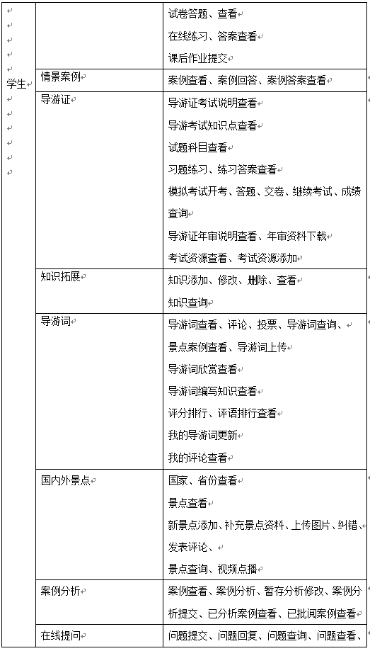 學(xue)(xue)生的(de)主要功能是導(dao)游(you)教學(xue)(xue)知識的(de)學(xue)(xue)習、完(wan)成情景推理中包含的(de)案(an)例及題目、導(dao)游(you)證考試學(xue)(xue)習及模擬考試、導(dao)游(you)拓展知識學(xue)(xue)習,同時可添加新的(de)知識供其他同學(xue)(xue)學(xue)(xue)習、導(dao)游(you)詞學(xue)(xue)習并編(bian)寫導(dao)游(you)詞、國內外景點(dian)學(xue)(xue)習、案(an)例分析和在線提(ti)問。