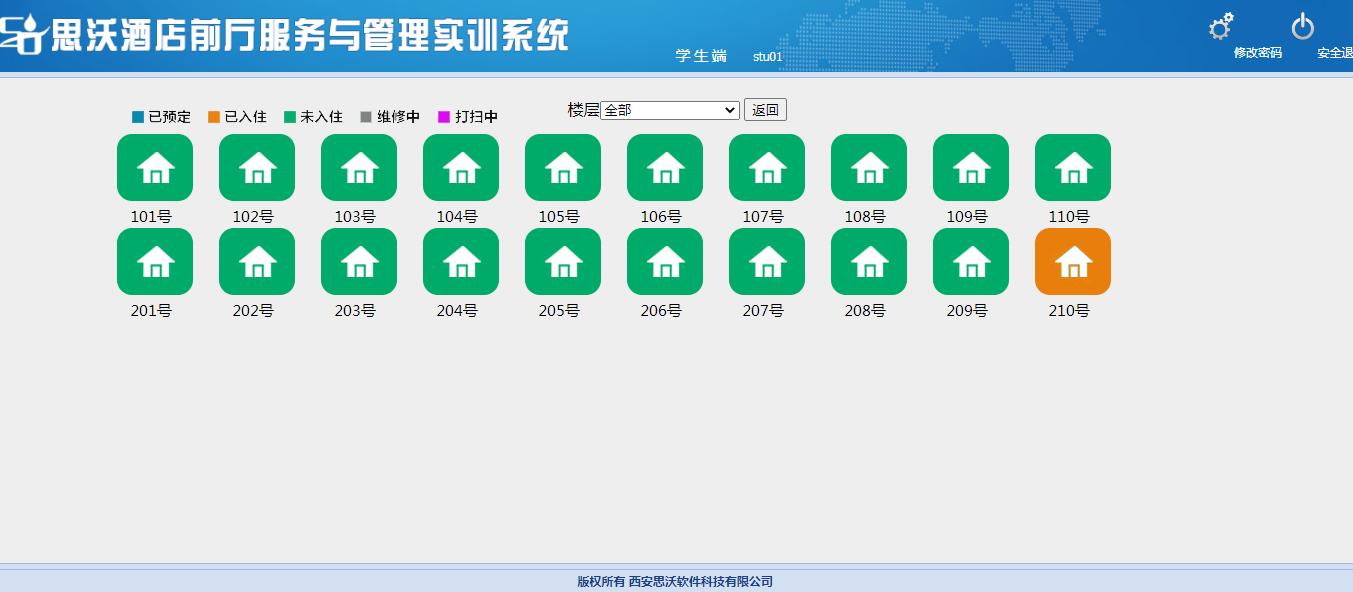 思沃(wo)酒店(dian)前廳服務(wu)與管(guan)(guan)理模(mo)擬實訓(xun)平(ping)臺(tai)系統以(yi)學生酒店(dian)前廳工作崗(gang)位任務(wu)為(wei)基礎,以(yi)案(an)例(li)動畫結合的模(mo)式(shi)開展情景模(mo)擬實訓(xun),學生可在該教學軟(ruan)件設置的虛(xu)擬酒店(dian)環境中,完成預定、入(ru)住辦理、續(xu)住、退房(fang)、換房(fang)、會員(yuan)管(guan)(guan)理、故障報(bao)修、投訴處理、黑名單等相關(guan)案(an)例(li)任務(wu)的操(cao)作。該教學平(ping)臺(tai)軟(ruan)件可以(yi)逼(bi)真的體驗實際(ji)酒店(dian)前廳工作的過程。本公司為(wei)了更好滿(man)足(zu)高校(xiao)(xiao)的教學需求,也會根據高校(xiao)(xiao)的需求提供酒店(dian)管(guan)(guan)理實訓(xun)室解決方案(an),