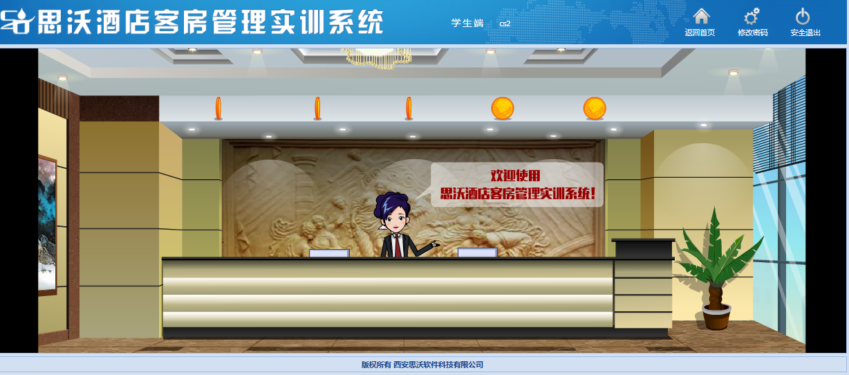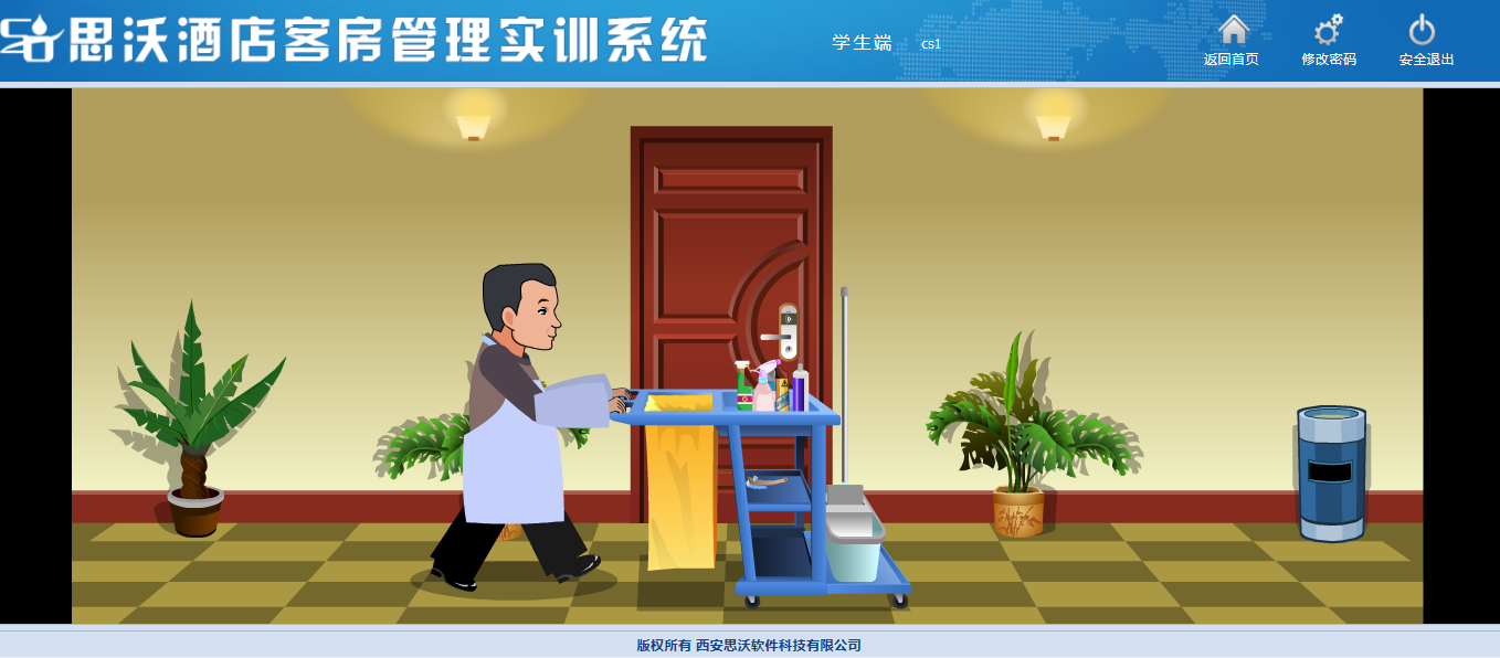 思沃酒(jiu)店客房(fang)(fang)管理(li)模擬實訓系統(tong)以flash動(dong)畫模擬酒(jiu)店情景,學生進入(ru)進行(xing)模擬客房(fang)(fang)管理(li)日(ri)常事務處理(li),包括客房(fang)(fang)設(she)計、引領(ling)入(ru)住、客房(fang)(fang)查房(fang)(fang)、客房(fang)(fang)整理(li)、布草間(jian)等類型實訓。