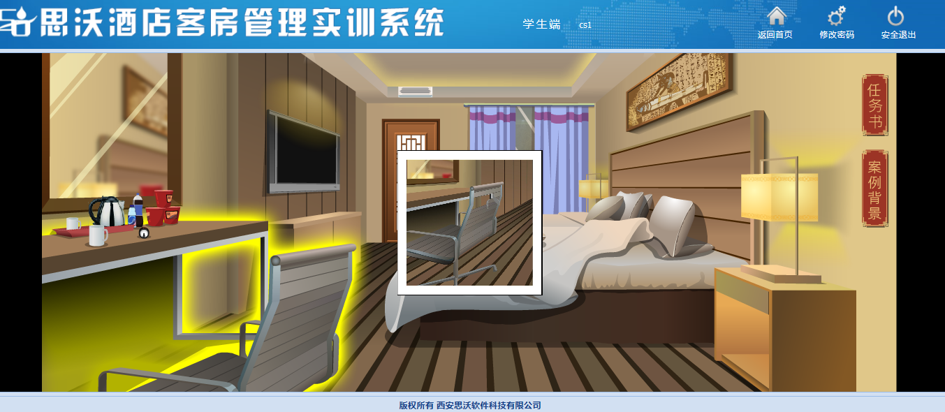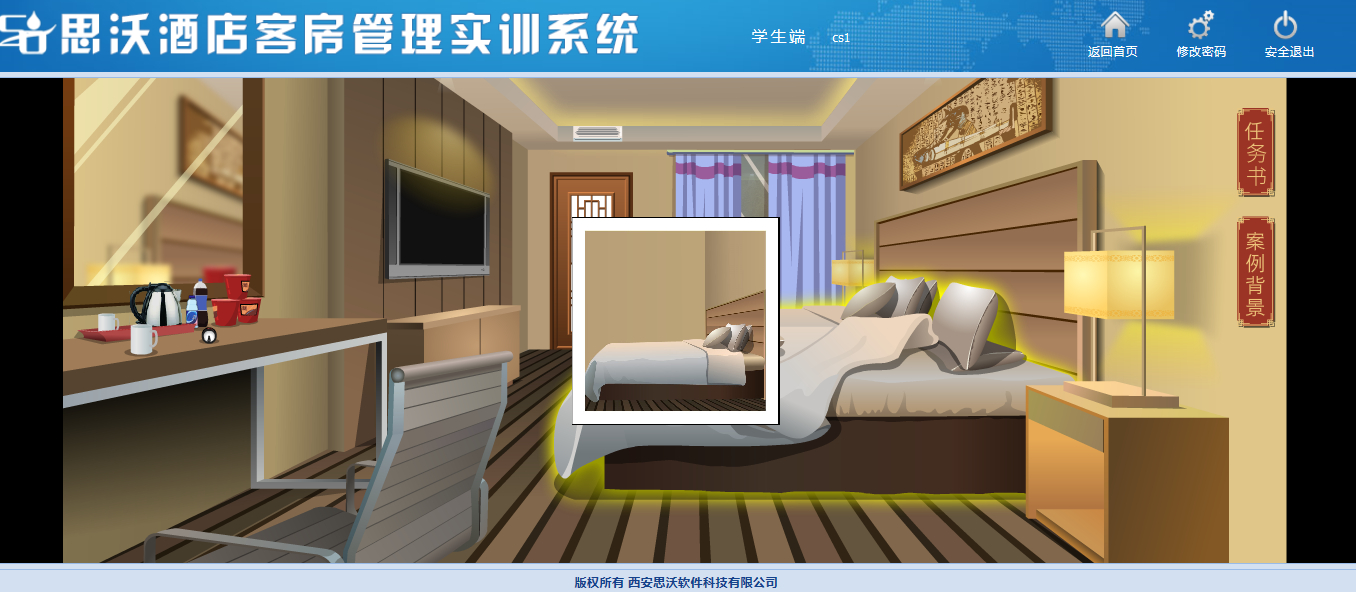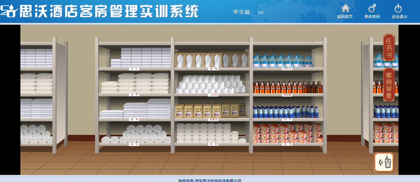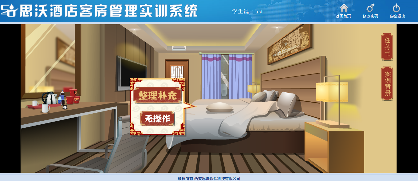 該教學(xue)(xue)(xue)軟(ruan)件平(ping)(ping)臺(tai)模(mo)擬客房場(chang)景(jing),學(xue)(xue)(xue)生通過(guo)場(chang)景(jing)互動進(jin)行模(mo)擬操(cao)作(zuo),包(bao)含任務(wu)書(shu)、案(an)例(li)背景(jing)等,學(xue)(xue)(xue)生在操(cao)作(zuo)過(guo)程中可(ke)隨(sui)時查(cha)看進(jin)度。學(xue)(xue)(xue)生通過(guo)該教學(xue)(xue)(xue)軟(ruan)件平(ping)(ping)臺(tai)的虛擬場(chang)景(jing)中可(ke)對床上用(yong)品、窗簾、電器(qi)、桌(zhuo)椅、茶幾上的消費(fei)商品、洗漱臺(tai)、馬桶、浴室(shi)等進(jin)行整理操(cao)作(zuo)。