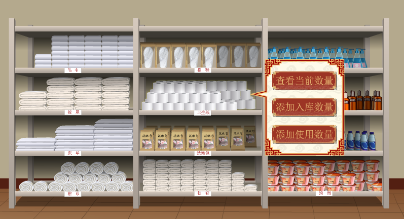 學生模擬工作人員通過動(dong)畫場景互動(dong)對(dui)布草間進行(xing)管(guan)理操作。并可查看床單、被罩、枕(zhen)套、浴巾、毛巾、洗漱包、洗發水(shui)等消耗物(wu)品的庫存數量,并判斷是否補(bu)充。