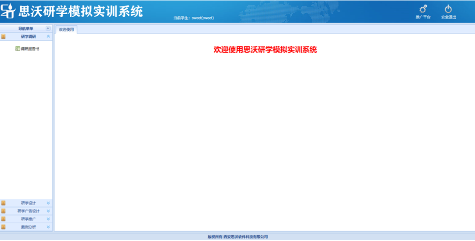 思(si)沃(wo)研(yan)(yan)(yan)學(xue)(xue)(xue)模擬實訓系統分(fen)為管理(li)員,教(jiao)師,學(xue)(xue)(xue)生(sheng)三種角(jiao)色,功能包括推(tui)廣(guang)平臺、首(shou)頁,知(zhi)識庫,研(yan)(yan)(yan)學(xue)(xue)(xue)推(tui)廣(guang),圖文結合廣(guang)告,媒體推(tui)送(song)廣(guang)告,研(yan)(yan)(yan)學(xue)(xue)(xue)調研(yan)(yan)(yan),研(yan)(yan)(yan)學(xue)(xue)(xue)設計(ji)等(deng)(deng)。學(xue)(xue)(xue)生(sheng)通過(guo)模擬實訓體驗(yan)從研(yan)(yan)(yan)學(xue)(xue)(xue)內(nei)容(rong)調研(yan)(yan)(yan)、研(yan)(yan)(yan)學(xue)(xue)(xue)路(lu)線(xian)設計(ji)、研(yan)(yan)(yan)學(xue)(xue)(xue)核心價值發掘、研(yan)(yan)(yan)學(xue)(xue)(xue)媒體網絡推(tui)廣(guang)等(deng)(deng)一系列工作內(nei)容(rong)。 研(yan)(yan)(yan)學(xue)(xue)(xue)軟件包含案(an)例(li)分(fen)析(xi),點(dian)評(ping),研(yan)(yan)(yan)學(xue)(xue)(xue)線(xian)路(lu)設計(ji),團隊類型(xing),機型(xing),小交通標準(zhun)(zhun)(zhun),出入(ru)境口岸,匯率維(wei)護(hu)(hu),酒(jiu)店(dian)類型(xing),研(yan)(yan)(yan)學(xue)(xue)(xue)類型(xing)知(zhi)識庫類型(xing),案(an)例(li)類型(xing),航空公司,線(xian)路(lu)區域,團隊等(deng)(deng)級(ji),住宿(su)標準(zhun)(zhun)(zhun),大交通標準(zhun)(zhun)(zhun),門(men)票標準(zhun)(zhun)(zhun),餐飲標準(zhun)(zhun)(zhun),導游(you)證類別,酒(jiu)店(dian)等(deng)(deng)級(ji),客(ke)戶(hu)行業分(fen)類,客(ke)戶(hu)等(deng)(deng)級(ji)分(fen)類,客(ke)戶(hu)關系深(shen)度,地(di)接車等(deng)(deng)級(ji),客(ke)戶(hu)接受程度,國(guo)家(jia)維(wei)護(hu)(hu),省(sheng)份維(wei)護(hu)(hu),城市維(wei)護(hu)(hu),景點(dian)類型(xing),學(xue)(xue)(xue)生(sheng)可以進行系統的模擬學(xue)(xue)(xue)習。