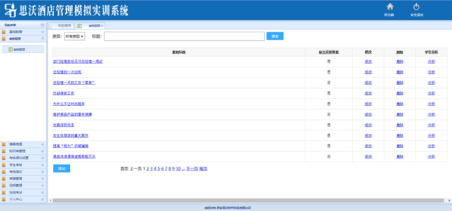 在(zai)線考(kao)(kao)試(shi)(shi)模塊(kuai),可創(chuang)建、發布、預覽考(kao)(kao)試(shi)(shi)試(shi)(shi)卷,設置(zhi)考(kao)(kao)試(shi)(shi)時間(jian)、規(gui)則等,自動生成考(kao)(kao)試(shi)(shi)成績(ji),統計考(kao)(kao)試(shi)(shi)結果。教師可以(yi)自主添加、修改、刪除、預覽、導入題(ti)(ti)(ti)目,題(ti)(ti)(ti)庫(ku)(ku)內置(zhi)1400+試(shi)(shi)題(ti)(ti)(ti),題(ti)(ti)(ti)型(xing)豐富,分為判斷題(ti)(ti)(ti)、單選題(ti)(ti)(ti)、多(duo)選題(ti)(ti)(ti)、填空(kong)題(ti)(ti)(ti)、問答題(ti)(ti)(ti)、論述題(ti)(ti)(ti)、名詞解釋等。 題(ti)(ti)(ti)庫(ku)(ku)涵蓋(gai)酒(jiu)店(dian)運營管(guan)理各關鍵(jian)環節(jie),從(cong)(cong)餐飲服務(wu)到客房管(guan)理,從(cong)(cong)市(shi)場(chang)營銷到人員培(pei)訓,旨在(zai)全面考(kao)(kao)查從(cong)(cong)業者對酒(jiu)店(dian)管(guan)理知識的掌握程度。