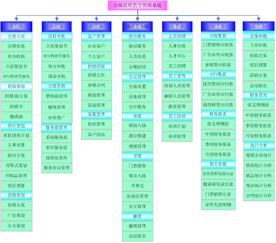 思沃會(hui)(hui)(hui)(hui)展(zhan)(zhan)(zhan)營銷模擬(ni)實(shi)訓(xun)系統(tong)以(yi)模擬(ni)會(hui)(hui)(hui)(hui)展(zhan)(zhan)(zhan)公(gong)司(si)的(de)(de)策(ce)劃(hua)部(bu)(bu)(bu)、外(wai)聯部(bu)(bu)(bu)、招(zhao)商部(bu)(bu)(bu)、會(hui)(hui)(hui)(hui)展(zhan)(zhan)(zhan)服(fu)(fu)務(wu)(wu)(wu)部(bu)(bu)(bu)、人事部(bu)(bu)(bu)、財務(wu)(wu)(wu)部(bu)(bu)(bu)以(yi)及(ji)總經(jing)辦7大業(ye)務(wu)(wu)(wu)部(bu)(bu)(bu)門為基礎而展(zhan)(zhan)(zhan)開實(shi)驗(yan)操(cao)作(zuo)的(de)(de)。該教學平臺軟件業(ye)務(wu)(wu)(wu)內容包括了:項(xiang)(xiang)目(mu)上報(bao)審批、項(xiang)(xiang)目(mu)的(de)(de)策(ce)劃(hua)安排、服(fu)(fu)務(wu)(wu)(wu)商管(guan)理(li)、人事招(zhao)聘與(yu)管(guan)理(li)、會(hui)(hui)(hui)(hui)展(zhan)(zhan)(zhan)的(de)(de)現(xian)場服(fu)(fu)務(wu)(wu)(wu)與(yu)合同管(guan)理(li)等等,讓學生通過(guo)實(shi)驗(yan)感受會(hui)(hui)(hui)(hui)展(zhan)(zhan)(zhan)項(xiang)(xiang)目(mu)的(de)(de)系統(tong)化管(guan)理(li)流程與(yu)業(ye)務(wu)(wu)(wu)操(cao)作(zuo)內容,不(bu)但(dan)能夠了解(jie)會(hui)(hui)(hui)(hui)展(zhan)(zhan)(zhan)項(xiang)(xiang)目(mu)從(cong)立(li)項(xiang)(xiang)審批到(dao)策(ce)劃(hua)、宣傳、招(zhao)展(zhan)(zhan)(zhan)招(zhao)商、現(xian)場服(fu)(fu)務(wu)(wu)(wu)以(yi)及(ji)會(hui)(hui)(hui)(hui)后(hou)總結各(ge)個(ge)環節的(de)(de)業(ye)務(wu)(wu)(wu),同時還(huan)可(ke)以(yi)掌握各(ge)種文案(an)的(de)(de)寫作(zuo)技巧(qiao),從(cong)而讓學生真正的(de)(de)理(li)解(jie)并掌握會(hui)(hui)(hui)(hui)展(zhan)(zhan)(zhan)這一行業(ye)的(de)(de)各(ge)種知識(shi)與(yu)業(ye)務(wu)(wu)(wu)要求。為學生以(yi)后(hou)的(de)(de)工(gong)作(zuo)、學習提(ti)供了一個(ge)實(shi)戰演(yan)練的(de)(de)實(shi)訓(xun)平臺,增強(qiang)了學生進(jin)入(ru)工(gong)作(zuo)崗位(wei)后(hou)的(de)(de)實(shi)力。