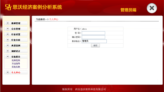 管(guan)理員端是主(zhu)要進行系(xi)統(tong)的基礎數據管(guan)理和設置(zhi)的,其中主(zhu)要包括教師管(guan)理、公告管(guan)理、行業設置(zhi)、行業分(fen)析、典型案例、調研(yan)設計、實驗報告、個人中心(xin)等主(zhu)要模塊。